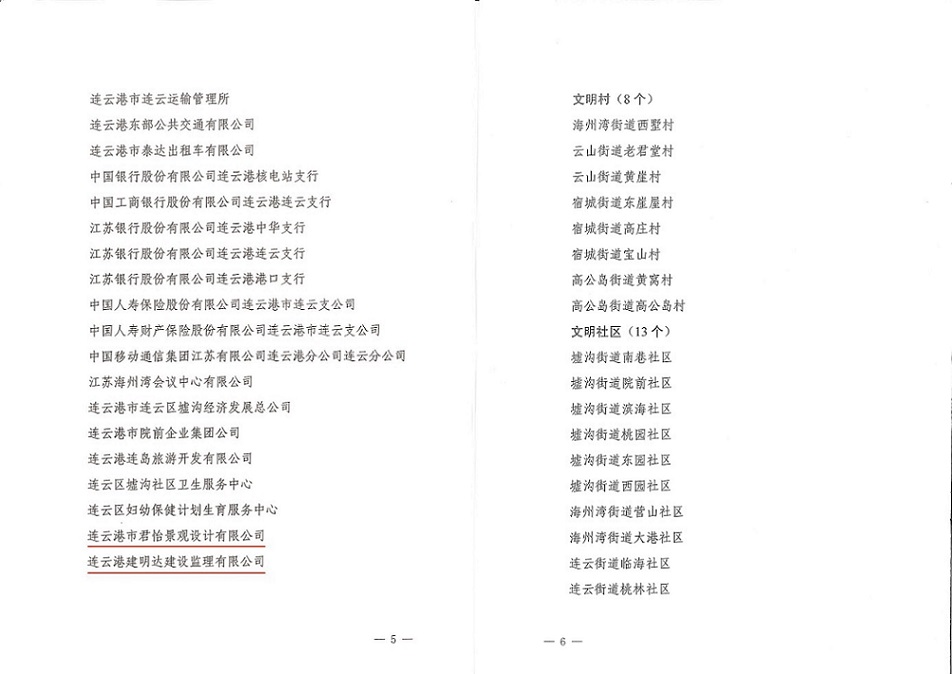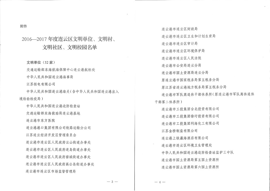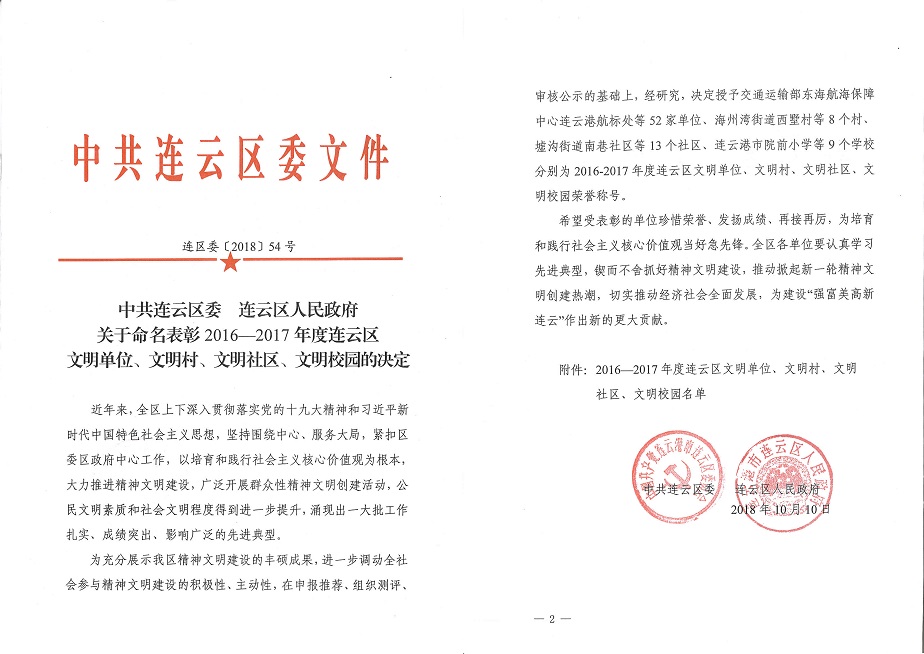 10月10日,中共連云區(qū)委、連云區(qū)人民政府發(fā)布《關(guān)于命名2016-2017年度連云區(qū)文明單位、文明村、文明社區(qū)、文明校園的決定》,我單位被授予“區(qū)文明單位”榮譽(yù)稱號(hào)。這是我單位精神文明創(chuàng)建工作的又一項(xiàng)豐碩成果。