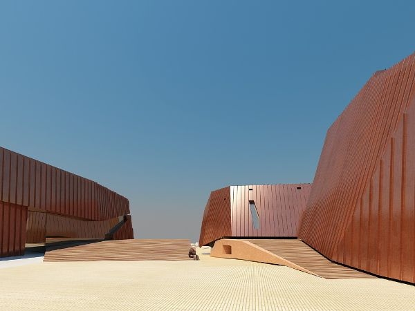 巨石設(shè)置在Salvokop山山腳,就像一塊露頭的巖石。建筑的墻體和屋頂都覆蓋了銅板,“露頭的巖石”將隨著時(shí)間的推移,逐漸銹蝕成綠色,與自然景觀融合在一起。