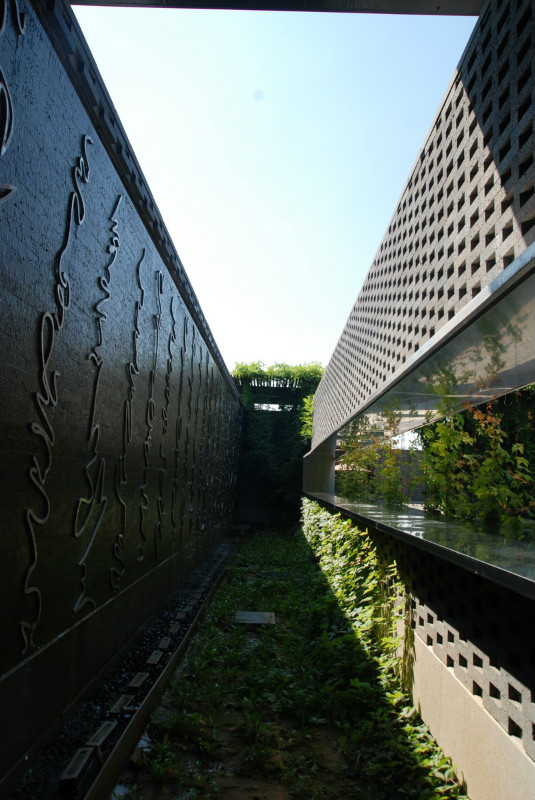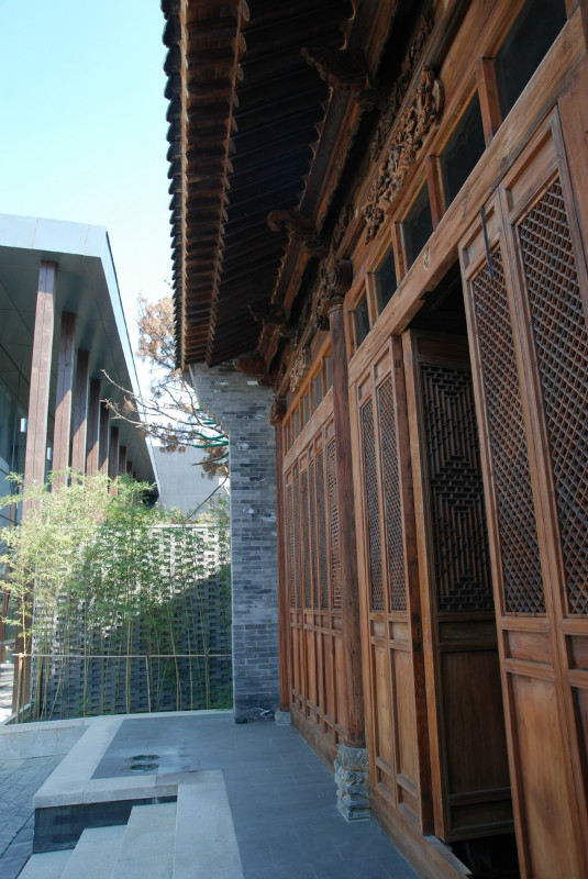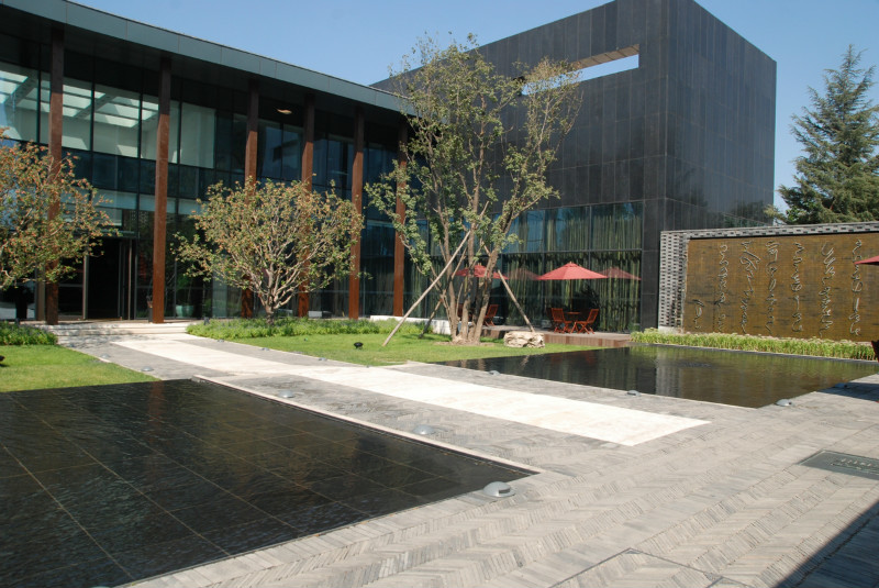 如園的建筑立面采用中國傳統(tǒng)建筑的經(jīng)典三段式,大屋頂、屋身和基座,而這當(dāng)中最為精華、最能體現(xiàn)中國傳統(tǒng)特質(zhì)的則是坡屋頂?!对娊?jīng)》有云:“如跂斯翼,如矢斯棘,如鳥斯革,如翚斯飛”。如園的屋頂正是由中國古建中的重檐頂提煉而來。其坡度平緩,上檐坡度18度,下檐坡度12度;出檐深遠(yuǎn),出挑墻面1.4米;上檐直線與曲線巧妙結(jié)合,成向上微翹的飛檐,不但在功能上增大了10層的采光面積,利于排水,外觀上更為輕盈。