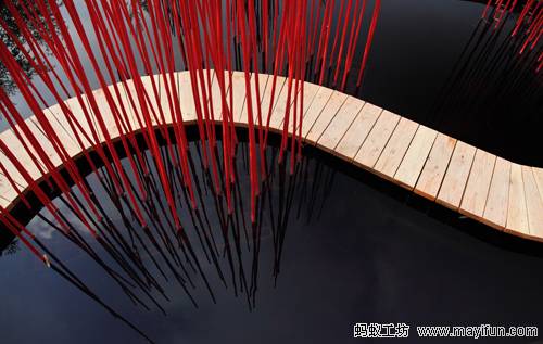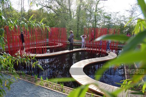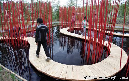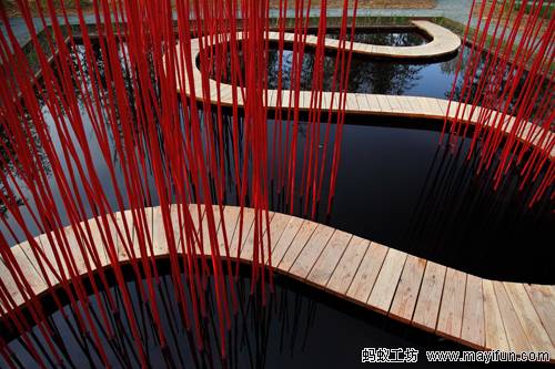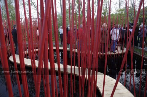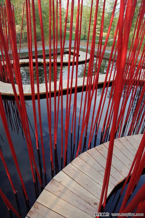 曲線形的木棧道對(duì)角穿越方形水池,漂浮于水面。小棧道僅50厘米寬,容一人穿行。它是“圓”的符號(hào),也是體驗(yàn)水池?zé)o限風(fēng)光的路徑。水池中間是三叢紅色竹竿,它們可取之四周竹林的老桿,是可再生的材料。垂直的竹竿叢沿木棧道分布,令行走在棧道上的游客體驗(yàn)穿越的快感。垂直的竹叢倒影水中,與變換的天景相輝映,創(chuàng)造出寧靜和深遠(yuǎn)的氛圍。雖然水深只有30厘米,卻通過垂直向天的紅色竹竿,創(chuàng)造出無限深遠(yuǎn)的感覺。方圓周邊和水中植物全部為中國(guó)植物,渲染出濃郁的中國(guó)氣氛。