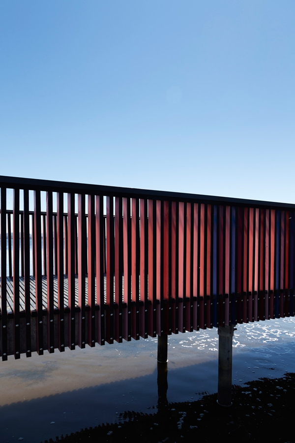 表面由窄木條鋪設(shè)而成,棧道上面的木欄桿則被漆成鮮艷的顏色來形成一種條紋狀圖案。兩個(gè)木結(jié)構(gòu)