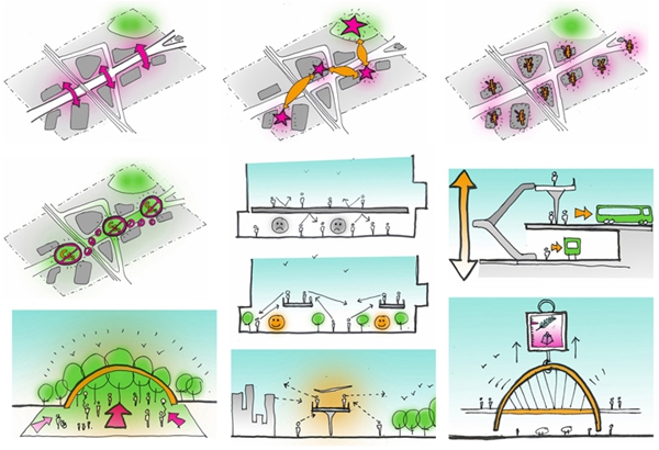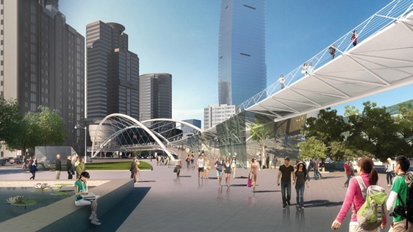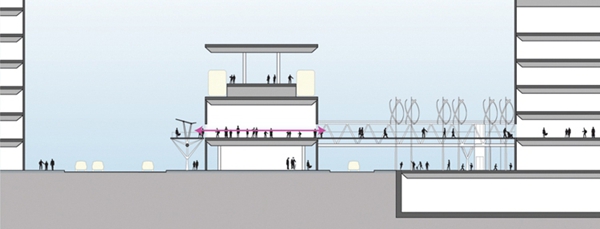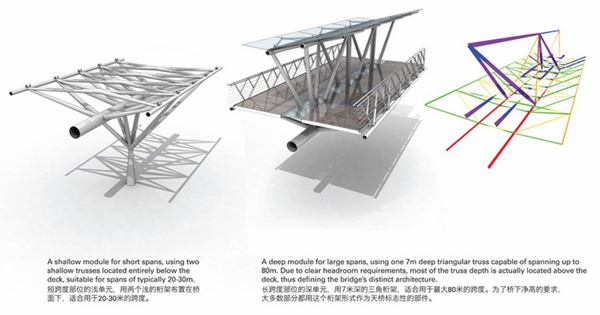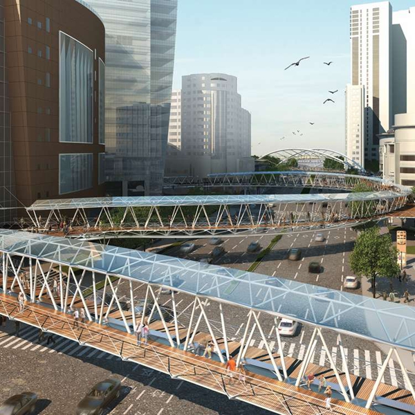 龍之翼是一個長達1.5公里的空中步行系統(tǒng),包含一個空中廣場和一組跨度70米的桁架,貫穿上海中山公園地塊最繁華的購物區(qū)。Arup Associates是該項目國際競標(biāo)的優(yōu)勝者,設(shè)計的主旨是打造一個天橋及空中平臺,不僅將高密度商業(yè)中心串聯(lián)起來,同時解決該地區(qū)繁雜的公共交通問題。這個系統(tǒng)連接了兩條地鐵線、多個購物中心和中山公園前廣場。設(shè)計團隊認(rèn)真開展了實地分析和行人流量研究,從使用者的角度出發(fā),充分考慮可達性和無障礙設(shè)計,將此核心商業(yè)區(qū)打造成一個方便行人活動的區(qū)域。
