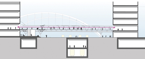 橋面根據(jù)連接的建筑二層標(biāo)高調(diào)整高度,并給橋下車輛通行留出足夠的空間,同時也不會對地鐵線路造成妨礙,從而極大地提升了行人在這個十字路口的通行體驗。長寧區(qū)多了一個新的地標(biāo)后,將吸引更多的游客和居民到此購物游玩。