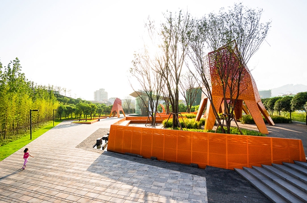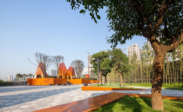 設(shè)計(jì)師從這些元素中汲取靈感設(shè)計(jì)了亭閣、“Z”形小道、公園地形,及與天空色對比的鮮艷色調(diào)。