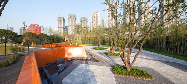綿延的山峰、四川盆地的山谷、水稻梯田、蜿蜒的長江和重慶灰白薄霧彌漫的神秘天際在公園周圍形成了巨幅的自然背景,建立了強(qiáng)烈的視覺聯(lián)系。