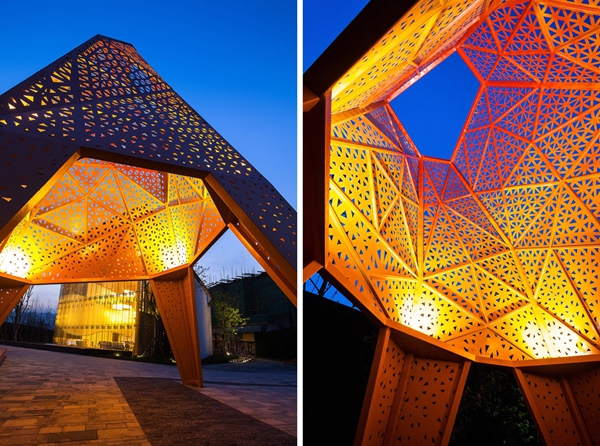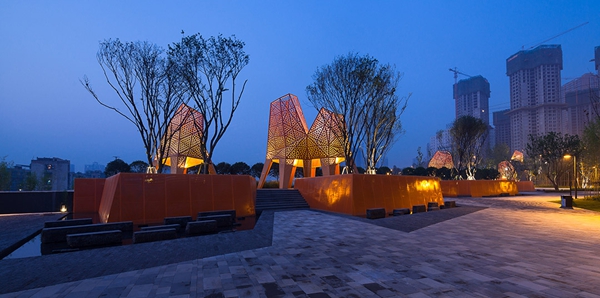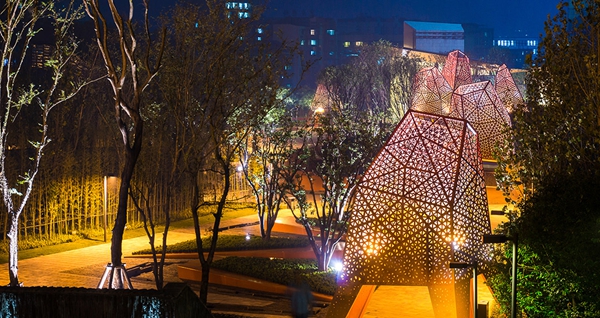 從楓溪路到達(dá)公園,入口處排列的舞動的紅色和橘色雕塑將游客引向廣場停車場。第一個亭子設(shè)在入口處,隨著亭閣沿山坡一路向下,可以看見延綿不絕的山峰。每個亭閣都沿著“Z”形小道精心布置,將人行步道引向下方的“山巒”,最終到達(dá)萬科銷售中心區(qū)域。白天,亭閣灑下陰涼;夜間,被燈光點(diǎn)亮的亭閣則變身為絢爛的“燈籠”。