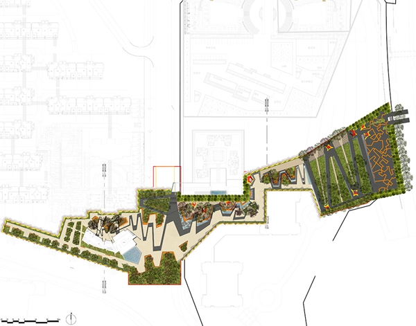 高差明顯的特殊地形為人行步道的設(shè)計(jì)帶來挑戰(zhàn),但同時為從上部停車場到最底層售樓中心的汽車通道提供了便利,形成一道獨(dú)特的“山形”動態(tài)景觀。